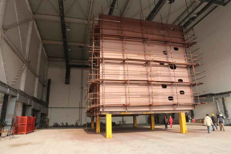 涂装车间采用车库式工艺流程,工件由液压自升式平板车运输,运输至固定工位。平板车的平台自动下降到工件脚手架,然后平板车退出,或者电动平板车将工件运送到指定位置。喷漆车间计划采用喷涂车库结构进行喷砂和喷漆作业。喷砂室中间机房布置:喷砂设备、带式输送机、螺旋输送机、斗式提升机、帘式分离器、颗粒储存箱、组合支架、维修平台、除尘器、风机等。喷漆室中间机房布置:漆雾过滤器、有机废气净化装置、电气中央控制室。