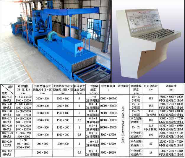 钢材预处理线专门加工6-200毫米钢板和0-300毫米型钢。钢材预热后,由送料输送系统送入封闭式抛丸清理室,钢球(铸钢球和钢丝球)由抛丸装置高速旋转的叶轮甩向工件表面,对工件进行冲击和刮擦,从而去除工件表面的铁锈和划痕。刮扫装置的高强度尼龙滚刷、接丸螺杆和高压吹管用于清理工件表面的丸粒、灰尘和浮尘。除锈后的钢材直接进入喷漆室,车间保养底漆通过安装在上下喷车上的喷枪喷涂在工件表面,然后进入烘房进行烘干。使钢材表面的漆膜达到干燥状态,并迅速送出。处理后钢材表面达到一定的粗糙度,提高了漆膜与钢材表面的附着力,相应提高了产品的耐腐蚀性和表面质量,提高了产品档次。