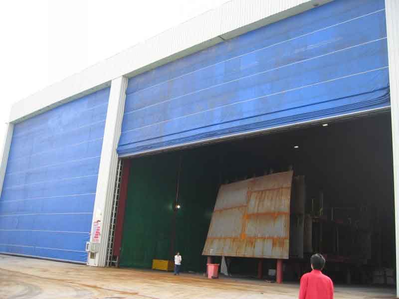 柔性升降门主要用于造船业的涂装车间和大跨度车间,替代重型钢门。一套安全可靠的起升机构用于闸门的折叠、提升和开启,主要由起升机构、门体(含三防PVC布)、安全防坠制动装置、限位器、合金导轨、电气控制系统等组成。它结构合理,运行轻便稳定,安全可靠。