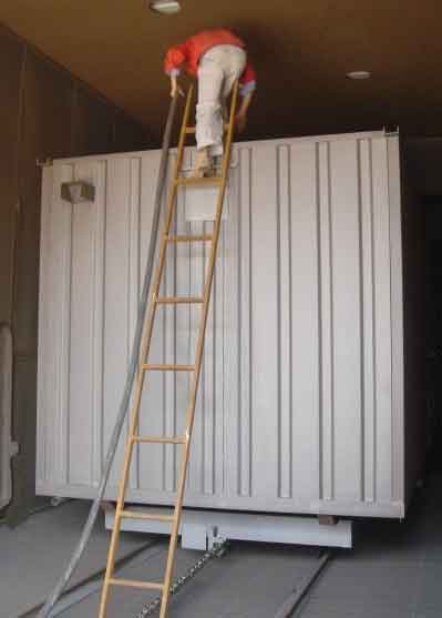 Container 抛丸清理机设备主要用于清理新建和大修的集装箱列车车体和大型部件表面的铁锈、氧化皮和焊渣,还可以降低工件的内应力,提高工件的疲劳强度,强化表面硬度。经该设备处理的工件可达到表面抛光处理的质量覆盖率。除锈表面清洁度达到GB8923(涂装前钢材表面锈蚀等级和除锈等级)中Sa2.5。表面粗糙度Ra3.2-12.5微米,提高了漆膜附着力,相应提高了产品的耐腐蚀性和表面质量。设备为机电一体化,自动化程度高。设备主要由:工件输送系统、前清理室、抛丸室、后清理室、吹灰及补喷系统、磨料循环系统、通风除尘系统、电气控制系统等组成。1.坑式基础:用于安装本设备的各种部件,包括坑、预埋件、直梯等。