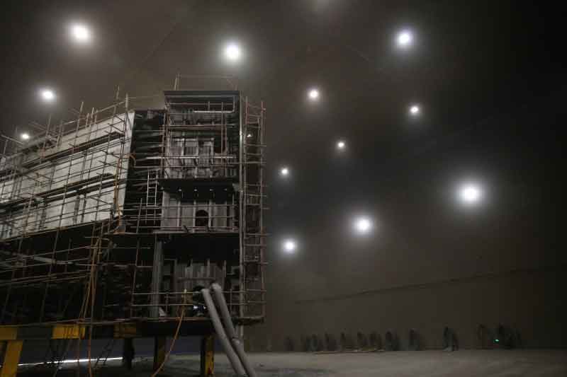 涂装车间采用车库式工艺流程,工件由液压自升式平板车运输,运输至固定工位。平板车的平台自动下降到工件脚手架,然后平板车退出,或者电动平板车将工件运送到指定位置。加工工件的喷漆车间拟采用喷漆车库结构进行喷砂和喷漆作业。喷丸室中间机房布置(固化作业):喷砂设备、皮带输送机、螺旋输送机、斗式提升机、帘式分离器、存丸箱、组合支架、维修平台、除尘器、风机等。喷漆室中间机房布置:漆雾过滤器、有机废气净化装置、电气中央控制室。
